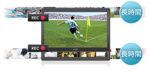 2番組同時録画の場合、両方とも長時間モードでの録画が可能。長時間モードで録画した場合(*)、標準のDRモードに比べ地上デジタル放送なら約5倍、BSデジタル放送なら約7倍の長時間録画が可能です。
