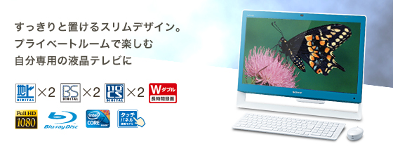 ソニーの液晶テレビ分野で培った技術を惜しみなく投入した、フルHD解像度(1920×1080ドット)の21.5型ワイド液晶「VAIOディスプレイプラス」を搭載。ハイビジョン放送と同じ縦横比16:9の大画面で、高精細な映像を臨場感豊かに堪能できます。プライベートルームで、自分専用のテレビとしても快適に使えます。