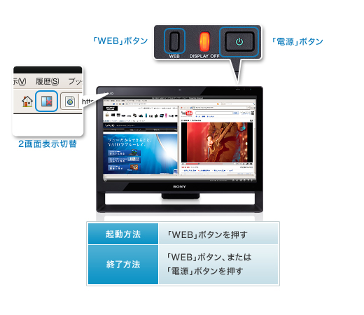 Windows OSを起動することなく、ワンボタンでインターネットブラウザーをクイック起動できます。電源オフの状態から「WEB」ボタンを押すだけで、インターネットにスピーディーにアクセス。お出かけ前など、時間のないときにニュース、天気、メールのチェックや乗り換え情報の検索などをするのに便利です。また、ブラウザーには、2画面表示のボタンを装備。ワンクリックで分割したり、閉じたりできます。動画サイトを見ながらWebページを参照するなど、 2つの画面を並列に表示して楽しめます。
