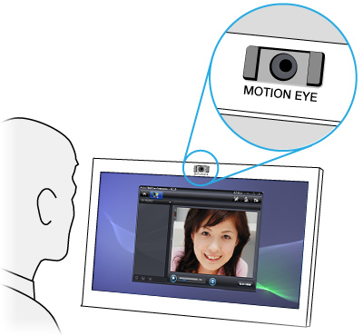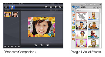 約131万画素のWebカメラ《MOTION EYE》と内蔵マイクで、テレビ電話やブログへの写真登録などがスムーズに楽しめます。ソフトウェア「Magic-i Visual Effects」を使えば、Webカメラの映像にフレームやエフェクトでユニークな演出を加えられます。