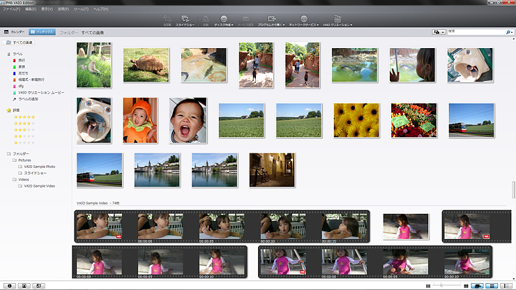 「PMB VAIO Edition」は、写真・ビデオの管理から作品づくりまで手軽にできるソニーオリジナルソフトウェア。たくさんの写真やビデオを自動で整理し、カレンダー表示。使いたい素材をすぐに探して、簡単操作でショートムービーやブルーレイディスクをつくれます。デジタル一眼レフカメラやハイビジョン“ハンディカム”で撮影した想い出のハイビジョン映像を、手軽に楽しく活用できる多彩な機能を備えました。
