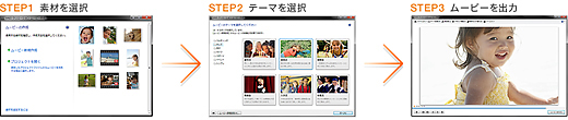 想い出の写真やビデオを使って手軽にショートムービーをつくれます。使いたい素材をセレクトし、テーマを選んで、「ムービー出力」ボタンを押すだけで完成。BGMやエフェクトが効いた本格的なムービー作品に仕上がります。