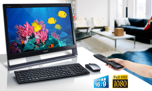 ハイビジョンを心ゆくまで楽しむために、ソニーの液晶テレビ分野で培った技術を惜しみなく投入。フルHD解像度(1920×1080ドット)の24型ワイド液晶「VAIOディスプレイプラス」を搭載しました。ハイビジョン放送と同じ縦横比16:9の大画面で、高精細な映像を臨場感豊かに堪能できます。また、画面まわりのベゼルに狭額縁デザインを採用。細いブラックフレームが映像を引き締め、鮮やかさを際立たせます。映像の美しさをじゃましないこだわりのフォルムが、まさにフルHD液晶テレビのような佇まいを実現します。