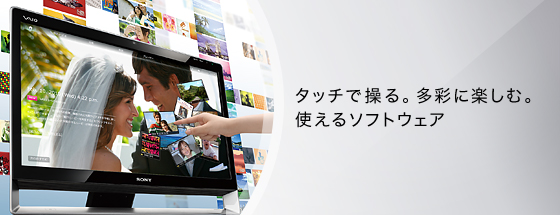 「Media Gallery」は好みや日付に合わせて、VAIO内の写真やビデオ、音楽のほかに、インターネット上のWeb動画などを探して表示してくれる、おすすめコンテンツプレーヤー。コンテンツをタッチ操作やクリックひとつですぐに再生し、同時に関連するコンテンツも次々と表示。たとえば、再生中に「撮影した時期が近い写真とビデオ」、「同じ2009年に発売された曲」などをおすすめしてくれます。意外な曲と出会ったり、想い出の写真を再発見したり。軽快な操作で好奇心といっしょに、次から次へコンテンツもつながっていく、新しい楽しみが広がります。