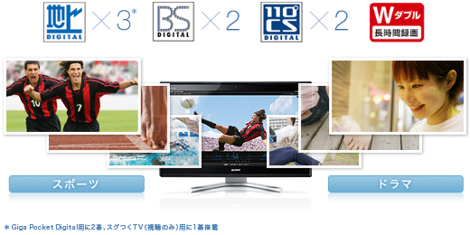 3波対応デジタルチューナーを2基搭載(*)。地上デジタル放送をはじめ、BSデジタル放送、110度CSデジタル放送を視聴できます。ダブルチューナーなので、見たい番組が重なっても安心。2つの番組を同時に録画したり、録画中に裏番組を見たりできます。さらに、2番組同時に長時間モードで録画することも可能です。