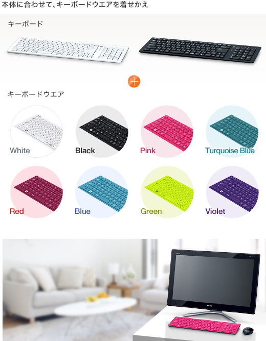 着せかえ感覚でキーボードに装着できる、キーボードウエア(別売)がさらに充実。従来のホワイト・ブラック・ピンクに加え、ブルー・グリーン・バイオレット・ターコイスブルー・レッドをラインアップしました。本体カラーと合わせたり、別の色と組み合わせたり、多彩なコーディネートが楽しめます。VAIOとの一体感を追求した薄さ約0.3mmのシリコン製なので、キーボードにぴったりフィット。ホコリや汚れの付着も防ぎます。