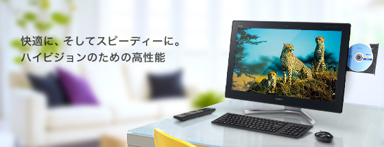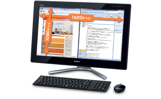 24型ワイドのフルHD解像度(1920×1080ドット)のLED液晶「VAIOディスプレイプラス」を搭載。ハイビジョン放送と同じ縦横比16:9の画面により、高精細な映像を画面いっぱいに表示可能。また、表示面積が広いので、インターネットとメールなど、2つの画面を並べて表示することもできます。