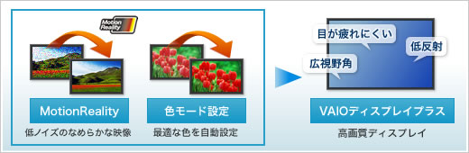 ノイズを低減し高画質化してなめらかな映像を観賞できる「Motion Reality」と、コンテンツに合わせて色を自動調整する「色モード設定」による最適化された映像を、広視野角、低反射の「VAIOディスプレイプラス」の液晶で再現。ディティールまで鮮やかに再生します。