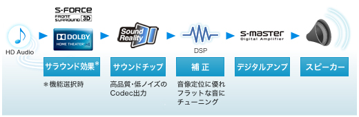 リアルな3Dサウンドが楽しめる「S-FORCE Front Surround 3D」や「Dolby Home Theater v4」により、映画や音楽ライブの臨場感を高めます。さらに、低ノイズの高音質サウンドチップ「Sound Reality」や解像感の高いクリアな音質のフルデジタルアンプ「S-Master」により、ハイクオリティなサウンドが楽しめます。