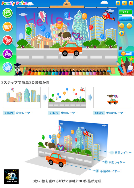 「Family Paint」は、誰でも手軽にお絵かきを楽しめるソフトウェア。タッチパネル対応なので、紙に絵を描く感覚で画面に直接触れて楽しめます。動物や乗り物などのスタンプや楽しいテンプレートが満載。写真を取りこんで、メッセージやイラストを入れることもできます。また、3D対応モデルは「Family Paint 3D」を搭載し、3ステップで簡単に3D効果がついた作品を作ることができます。
