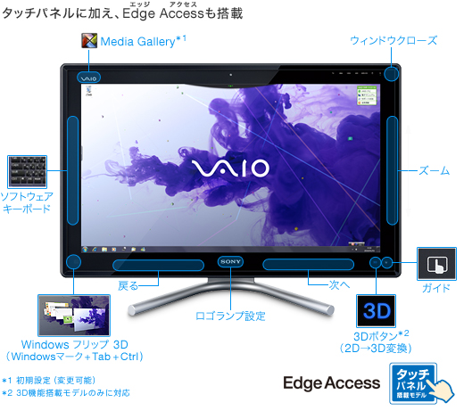 OS Windows 7のタッチ機能を生かした、光学式タッチパネルを搭載。液晶部に実装した光学式センサーと反射板により、最大2点までのマルチタッチに対応。マウス使用と同じ基本操作はもちろん、「Media Gallery」などの対応ソフトウェアでは送りや拡大、回転などの操作も、指で画面に触れて直感的に行えます。さらに、液晶周りのベゼル部分もタッチ操作に対応。ウィンドウを閉じたり、拡大/縮小したり、さまざまな操作がベゼル部分でもできるので、より便利に使えます。
