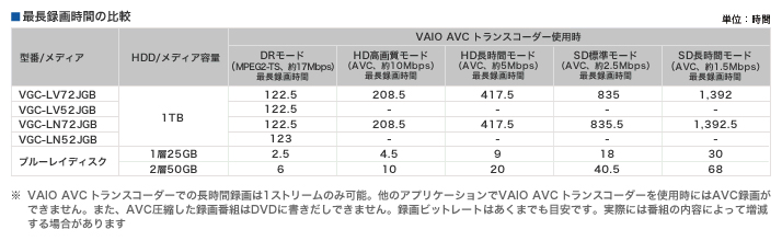 画質劣化を抑えながら映像を高圧縮する「VAIO AVC トランスコーダー」を搭載。ハイビジョン画質のまま長時間録画が可能になりました。DRモード(MPEG2-TS)と比較して、たとえばHD長時間モードなら同じディスク容量で最長約3倍の録画時間。標準画質のSD長時間モードなら最長約11倍もの長時間録画ができ、デジタル放送をたっぷり保存することができます。