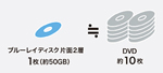 ブルーレイディスクは、片面2層で約50GBの大容量を実現。ディスク1枚にDVD約10枚分もの記録ができます。ハイビジョン映像を、そのままの画質で約6時間分の録画(*)が可能です。