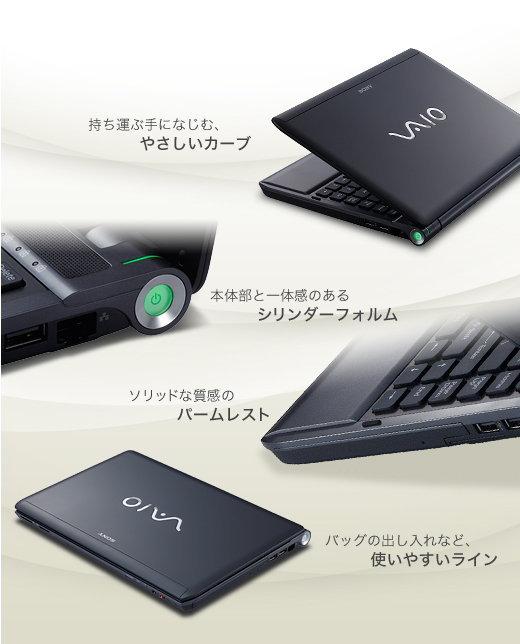 エッジ部に丸みがあり、手になじむやさしいカーブを持った天板。パワーボタンが印象的なシリンダー。キートップと同じ高さで疲れを低減するパームレスト。バッグの出し入れが多いモバイルで使いやすい角を絞ったフォルムなど、使いやすさと美しさを兼ね備えたデザインです。