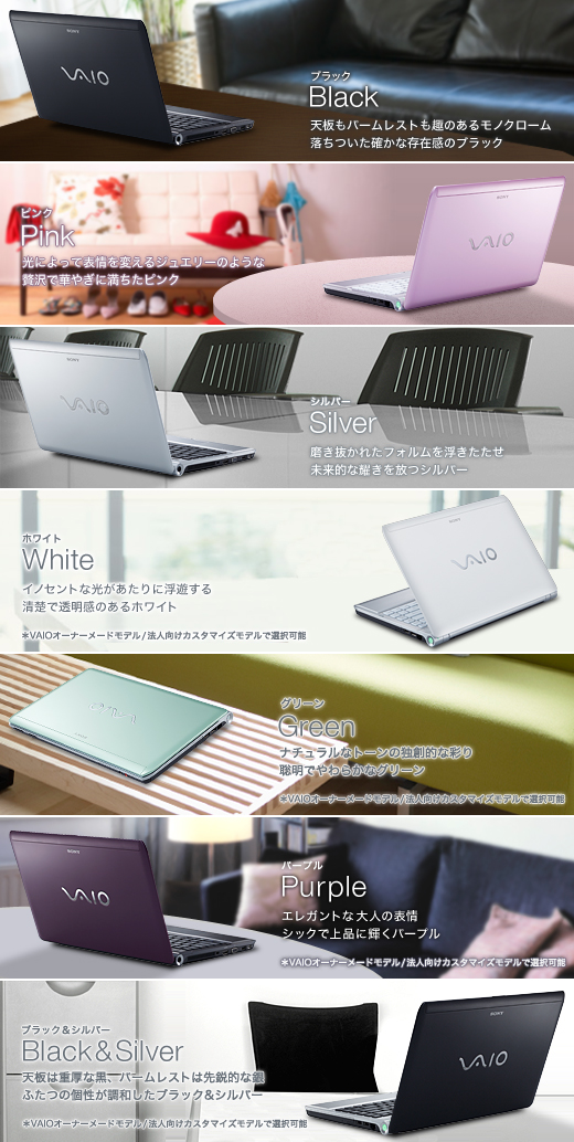 ブラック、ピンク、シルバー、ホワイト(*)、グリーン(*)、パープル(*)と、天板がブラックでパームレストがシルバーという2つの顔を持ったブラック&シルバー(*)の7色をラインアップ。お好みのカラーを選んで自分らしさを演出できます。