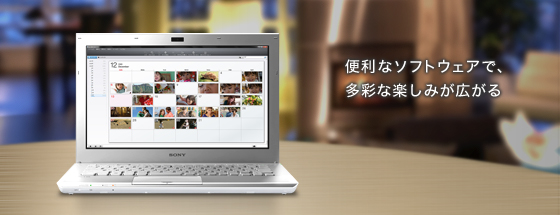 「PMB VAIO Edition」は、写真・ビデオの管理から作品づくりまでが手軽にできるソニーオリジナルソフトウェア。VAIOに取りこんだ写真やビデオを、自動で撮影した日付やフォルダごとに整理してくれて、カレンダーで表示。手ぶれ写真の補正や使いたい素材の検索もスピーディー。さらに、ショートムービーや映画作品のようなメニューつきオリジナルディスクの作成も簡単操作で行えます。