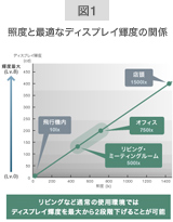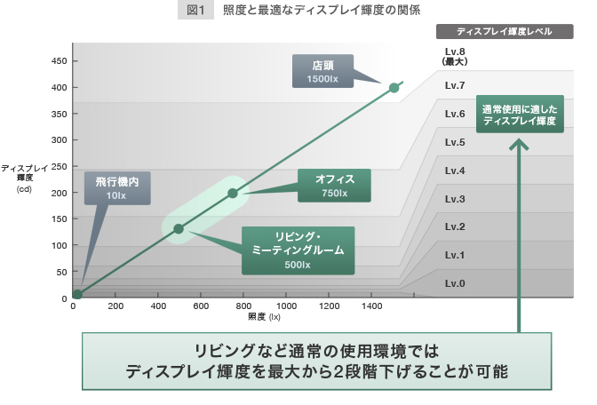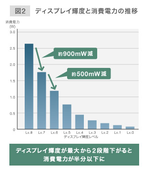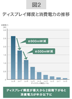 液晶は、常に最高輝度が必要なわけではありません。明るすぎるとかえって見づらくなり、電力が無駄になっているケースもあります。たとえば、リビングやオフィスなどでは輝度を最大から2段階ほど下げても快適に使用することが可能です(図1)。それにともない、消費電力も半分以下に低減できます(図2)。