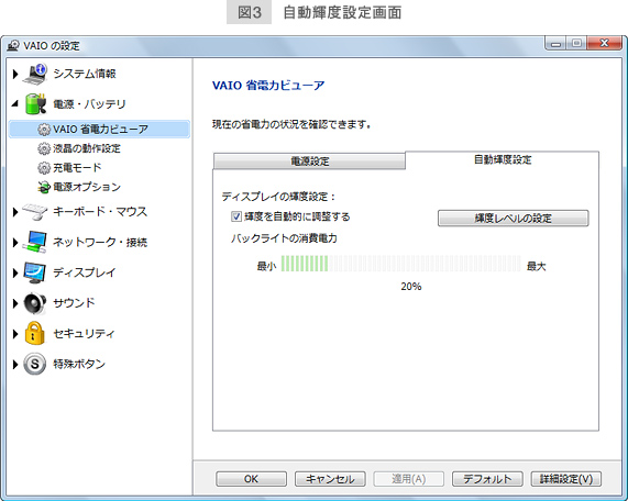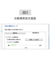 液晶は、PCがアイドル状態でも消費電力が大きいデバイス。その輝度を最適化することで、消費電力を抑え、バッテリー駆動時間をのばすことが可能になります。自動輝度設定画面(図3)で消費電力率を視覚的に確認できるので、効果が手に取るようにわかります。また、液晶の輝度変化は、気づかないくらいに自然に変わっていきます。