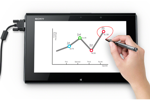 ペン入力に対応したソフトウェアも充実。「OneNote」や「PowerPoint」など「Office 2010」のソフトウェアなら、筆圧を感知するため、細いペン先で細かい表現が可能です。また、「Note Anytime for VAIO」なら、豊富なペンスタイルを使用可能なほか、「Active Clip」で切り抜いた画像をそのまま貼り付けることもできます。