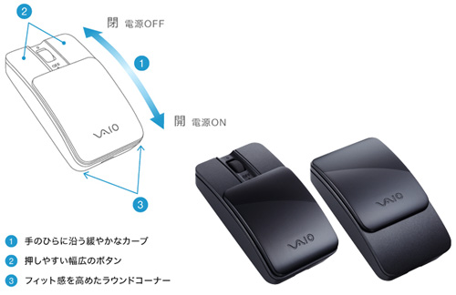 Bluetooth機能搭載のVAIOとすぐに使えるワイヤレスマウスです。受信部を外付けする必要がないため、USBアダプターを挿す手間が省ける上、出っ張りもなくスマートに使えます。Bluetooth Ver3.0に対応し、従来品に比べて省電力化されました(バッテリー寿命 約1.5ヶ月から約3ヶ月へ向上)。