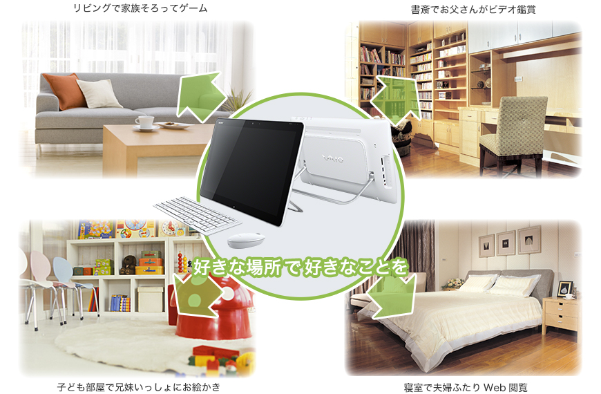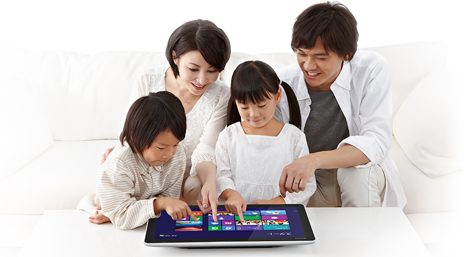 20型ワイド(1600×900ドット)の家族で囲んで楽しめる画面サイズ。IPS方式のディスプレイを採用することで、どの角度からでも見やすい画面を実現しました。もちろんWindows 8の機能を最大限に活用できる静電式タッチパネルを搭載。指先で画面に触れて軽快に操作できます。家族みんなでタッチしても指紋や汚れが目立ちにくい専用液晶保護シートも用意しています。