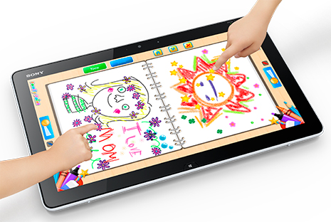 タッチ操作で楽しめる多彩なソフトウェアを搭載。2つのキャンパスで同時にお絵かきができ親子や兄弟で一緒に楽しめる「Family Paint」。動物や乗り物などのスタンプやテンプレートが満載のほか、写真を取りこんで、メッセージやイラストも入れられます。また、写真やビデオ、ボイスメッセージなどを登録して、家族の伝言板として楽しく使える「Fingertapps Organizer(フィンガータップスオーガナイザー)」。ショートムービーをタッチで作成できる「VAIO Movie Creator」など、家族みんなでタッチの楽しさが味わえます。