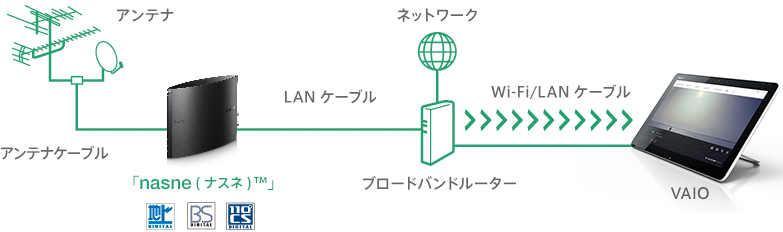 別売の「nasne(ナスネ)™」とつなげば、VAIO Tap 20が「テレパソ」になります。「VAIO TV with nasne™」を使って、地上デジタル放送はもちろん、BSデジタル放送や110度CSデジタル放送の視聴も可能。 LANケーブルはもちろん、Wi-Fiでも接続できる(*)ので、バッテリー搭載のVAIO Tap 20なら家じゅうの好きな場所からワイヤレスで「nasne(ナスネ)™」にアクセスして、20型の大画面ワイヤレステレビとして放送中や録画した番組を楽しめます。