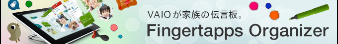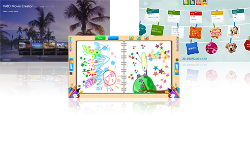 タッチ操作で楽しめる多彩なソフトウェアを搭載。2つのキャンパスで同時にお絵かきができ親子や兄弟で一緒に楽しめる「Family Paint」。動物や乗り物などのスタンプやテンプレートが満載のほか、写真を取りこんで、メッセージやイラストも入れられます。また、写真やビデオ、ボイスメッセージなどを登録して、家族の伝言板として楽しく使える「Fingertapps Organizer(フィンガータップスオーガナイザー)」。ショートムービーをタッチで作成できる「VAIO Movie Creator」など、家族みんなでタッチの楽しさが味わえます。