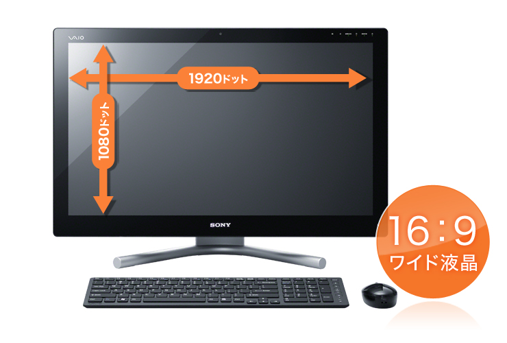 ソニーの液晶テレビ分野で培った技術を惜しみなく投入した、フルHD解像度(1920×1080ドット)の24型ワイド液晶「VAIOディスプレイプラス」を搭載。ハイビジョン放送と同じ縦横比16:9の大画面で、高精細な映像を臨場感豊かに堪能できます。また、LEDバックライトの採用により、従来のCCFLバックライト(蛍光管)に比べて発光効率が高く、消費電力も低減しています。