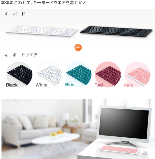 着せかえ感覚でキーボードに装着できる、多彩なキーボードウエア(別売)をブラック・ホワイト・ブルー・レッド・ピンクの計5色ラインアップ。好みに合わせてコーディネートが楽しめます。VAIOとの一体感を追求した薄さ約0.3mmのシリコン製なので、キーボードにぴったりフィット。ホコリや汚れの付着も防ぎます。