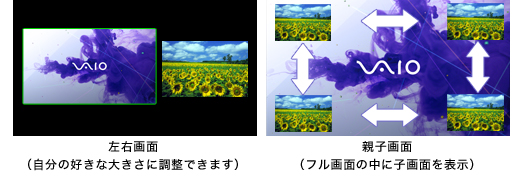 テレビの映像+PCの画面を映しだせます。たとえばPCを使いながら、子画面でスグつくTVを視聴できます。