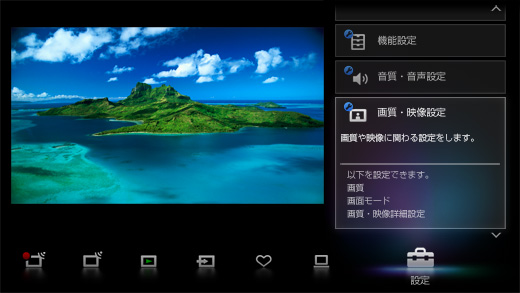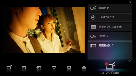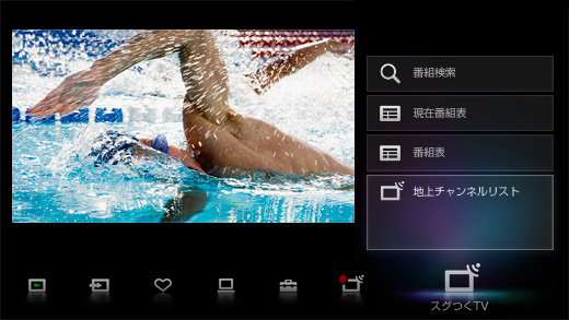 操作画面は、なめらかで直感的なので、多彩なメニューをスムーズに操作できます。視聴中のテレビ画面を少し縮小し、画面の下部に再生可能なカテゴリーや各種機能アイコンを配置。カテゴリー内のコンテンツは画面右側にリスト表示されます。