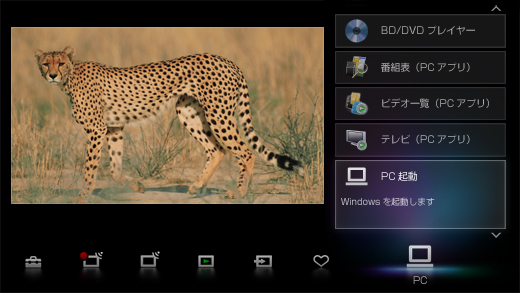 リモコンの十字キーの左右ボタン操作で、各種設定などがテレビ画面を見ながら操作できます。また、PCの起動や「Giga Pocket Digital」などのリモコン操作が可能なPCアプリへの切り替えも行えます。画面右下に手をかざすと「Edge Access」ボタンが点灯しメニュー画面の操作(*)も可能です。