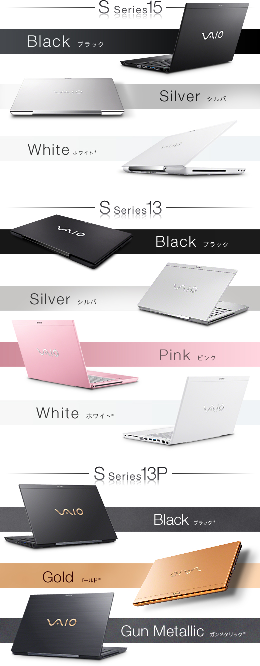 Sシリーズ15は、ブラック/シルバー/ホワイト(*)。Sシリーズ13はブラック/シルバー/ピンク/ホワイト(*)と、豊富なカラーバリエーションをご用意。外装とパームレストが同色の1トーンデザインを採用しました。さらに、VAIOオーナーメードモデル/法人向けカスタマイズモデルでは、質感と堅牢性を両立させたカーボン天板採用の「Sシリーズ13P」をラインアップ。ブラック(*)/ゴールド(*)/ガンメタリック(*)といった専用カラーに加え、ピンクゴールドのVAIOロゴを採用することで、質感を高めています。