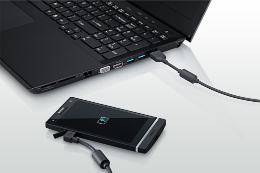 PC本体の電源がオフで、AC電源非接続時でも給電が可能なUSB端子を搭載。外出先で、スマートフォンや携帯音楽プレーヤーのバッテリーがなくなった時でも、手軽に充電ができて便利です。