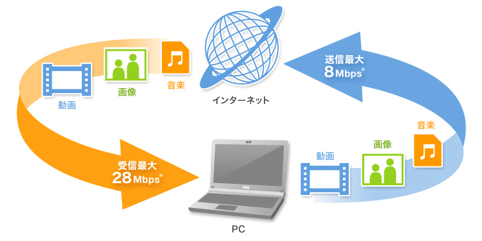 ひとつの基地局でカバーするエリアが広く、よりアクティブなモバイル環境を実現する高速モバイルインターネットWiMAX(ワイマックス)に対応。IEEE 802.16eをもとに規格化された世界標準の通信技術です。受信最大28Mbps(*)、送信最大8Mbps(*)というブロードバンド環境で、動画などの大容量データを外出先でも快適に送受信できます。
