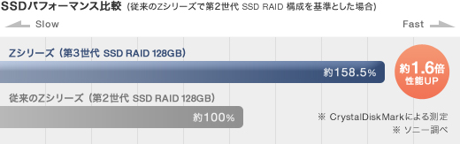VAIOオーナーメード/法人向けカスタマイズモデルでは、最大約512GBのデュアルSSDを選択可能。「第3世代 SSD RAID」採用により、従来機種と比べて圧倒的なパフォーマンスを実現。データの読み出しや書き込みが一層スムーズです。