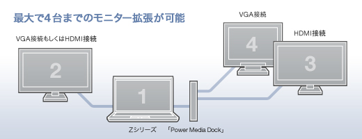グラフィックアクセラレーターや光学ドライブ、多彩なインターフェースを備えた「Power Media Dock」を用意(別売)。本体に接続することで、パフォーマンスや機能をさらに高めることができます。自宅やオフィスでは「Power Media Dock」を接続することでメインマシンとして、外出するときは軽快に持ち歩けるモバイルノートとして、それぞれシーンに応じた最適な使い分けができる新たなスタイル「THE ZOOM(*) STYLE」を提案します。