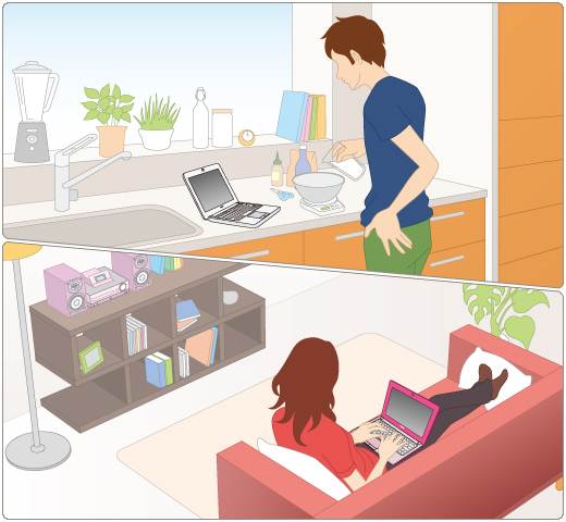ケーブルにつながなくても、インターネットやメールを楽しめるワイヤレスLAN機能(IEEE 802.11 b/g/n(*))を内蔵。たとえば、キッチンに持ち運んでレシピサイトを見ながら料理をしたり、オーディオルームでお気に入りの曲を聴きながら音楽サイトをチェックしたりと、使い方はいろいろ。家の中はもちろん、外出先でもワイヤレスLANを利用して気軽にインターネットへアクセスできるので、毎日の暮らしがもっと楽しく、便利になります。