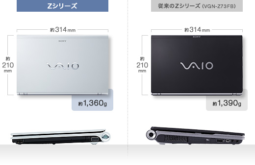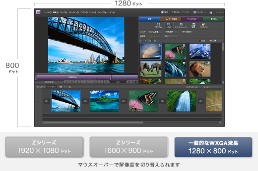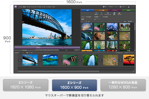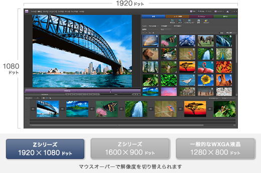 標準仕様(店頭販売)モデルは1600×900ドット、NTSC比100%(*)。13.1型の[VAIOディスプレイプレミアム]液晶を搭載。さらに、VAIOオーナーメード/法人向けカスタマイズモデルはフル HD液晶1920×1080ドットの高解像度液晶の選択が可能。広い作業領域により、写真のサムネイル表示等の一覧性も高く快適に使えます。しかも、Adobe RGBカバー率96%の広色域により、美しい色再現性を実現しました。また、どちらも縦横比16:9。ハイビジョンのワイドコンテンツも美しく画面いっぱいに再現します。