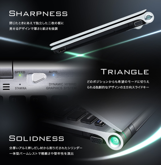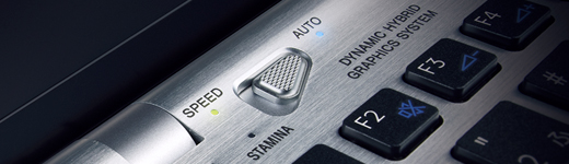PCを再起動することなく、使用場所や用途に応じてグラフィック性能を切り替えられる「ダイナミック・ハイブリッドグラフィックス」機能を搭載。3方向スイッチをシフトすることより、オフィスや自宅では「NVIDIA GeForce GT 330M GPU」を使用したハイパフォーマンスのSPEEDモード。外出先ではチップセット内蔵のグラフィックアクセラレーターを活用、ディスプレイ輝度も自動調整し、消費電力を抑えるSTAMINAモードへの切り替えが可能(*)。さらに、AUTOモードでは自動的に最適なモードに切り替え。Zシリーズは、さまざまなシーンやニーズに、これまでにないスピードとインテリジェントで応えます。