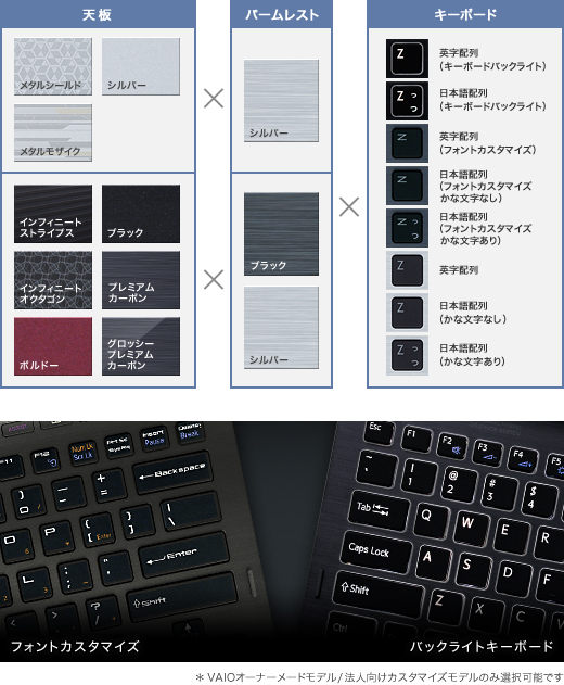 VAIOオーナーメードモデル/法人向けカスタマイズモデルなら、天板とパームレストの色、キーボードは英字配列と日本語配列、バックライトの有無、フォントカスタマイズが選択できます。日本語配列の場合は、かな文字のあり/なしも選択可能。好みに合わせて自分らしくカスタマイズできます。