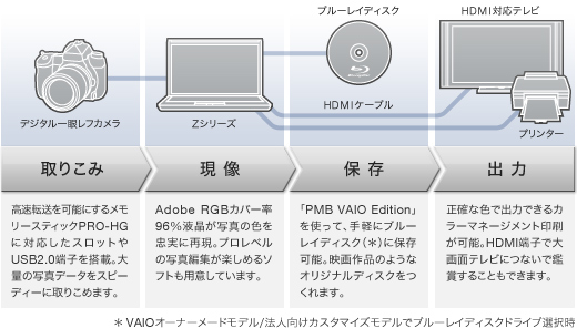 1920×1080ドットの[VAIOディスプレイプレミアム]や最新のアーキテクチャーの採用により、モバイルPCでありながら、ハイビジョン映像を快適に操れる編集環境を実現。ハイビジョン“ハンディカム”で撮影したその場で、編集からブルーレイディスクへの保存まで行えます。