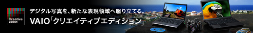VAIOオーナーメードモデル/法人向けカスタマイズモデルで「Adobe Creative Suite 5 Production Premium」が選択できます。ビデオ編集やモーショングラフィックス、ビジュアルエフェクトなどの映像関連や、最先端のRAW画像処理といったデジタルフォトの作業を効率的に行える最新のクリエイティブツールです。プロの要求にも応える高機能ソフトにより、モバイルPCながら、本格的な写真・映像制作が楽しめます。