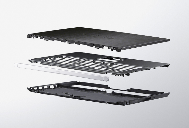 モバイルシーンをスタイリッシュに演出するブラック・ブルー(*)・ゴールド(*)・カーボンブラック(*)の4色をラインアップ。洗練されたスマートなフォルムと上質なカラーが、持つ人のセンスを際立たせます。さらに、ヘアライン加工を施したアルミ一体成型のヒンジ部にはSONYのロゴを刻印し、持ち運びやキャリングケース(別売)からの出し入れの際など、さりげないタイミングでもオーナーシップを感じることのできる、こだわりのデザインを採用しました。