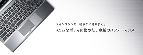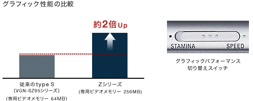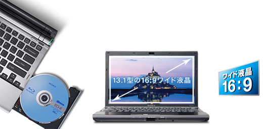 標準仕様(店頭販売)モデルVGN-Z73FBでは、従来の35W CPUと比較し、低消費電力の28W標準電圧版CPUを搭載。メモリーもハイパフォーマンスながら消費電力が少ないDDR3メモリーを採用しています。こうした省電力化への取り組みにより“スタミナ”も向上。標準バッテリー搭載時は、外出先での作業にも十分な約10.5時間(*3)のスタミナを確保しています。さらに大容量バッテリーを装着すれば、最長約16時間(*3)の長時間駆動が可能です。メインマシンのパフォーマンスを備えながら、軽快に持ち歩き使いこなせる優れた機動性を実現しました。