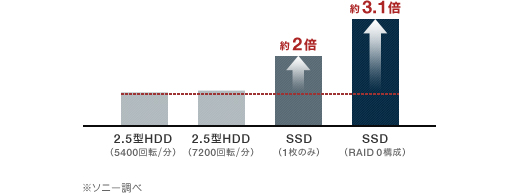 VAIOオーナーメードモデル/法人向けカスタマイズモデルでは、最大約500GBで、高速7200回転/分を実現したハードディスクドライブを選択可能。大容量のデータも余裕で保存できます。さらに、約256GBのSSDを2枚搭載した、約512GBのSSDを選択可能です。SSDはハードディスクのように磁気ヘッドの移動による時間のロスがなく、PC動作がスムーズです。さらに、2基のSSDに同時にアクセスするRAID 0(ストライピング)構成としているため、さらにパフォーマンスが向上します。これにより、データの転送速度がハードディスク(5400回転/分)に比べ約3.1倍高速になります(*)。