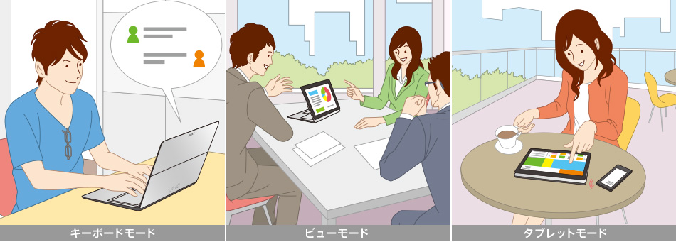 今まで通りの使い方ができるキーボードモードから、液晶画面を回転させて資料共有に便利なビューモードに。そして、そのまま液晶面を上にして閉じればタッチ操作に最適なタブレットモードに。カタチを変えて、シーンに合わせて最適な使い方ができるこれからのスタンダードモバイルPCです。