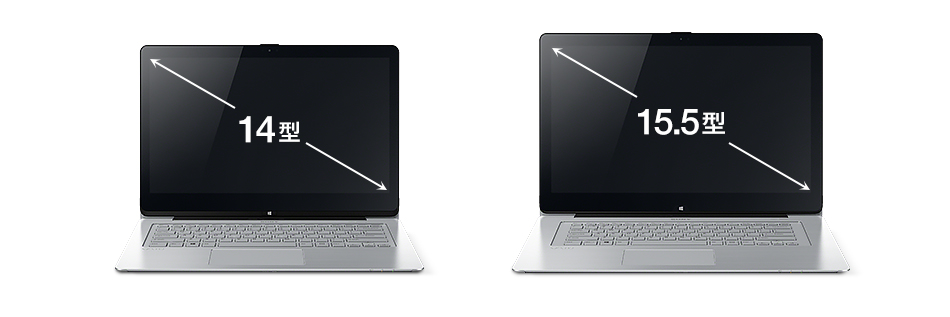 一般的なノートPCより一回り小さく持ち運びも手軽な14型ワイド、写真や映像を快適に楽しめる大きな画面を備えた15.5型ワイドの2つのサイズを用意。使うスタイルや好みにあわせて選べます。