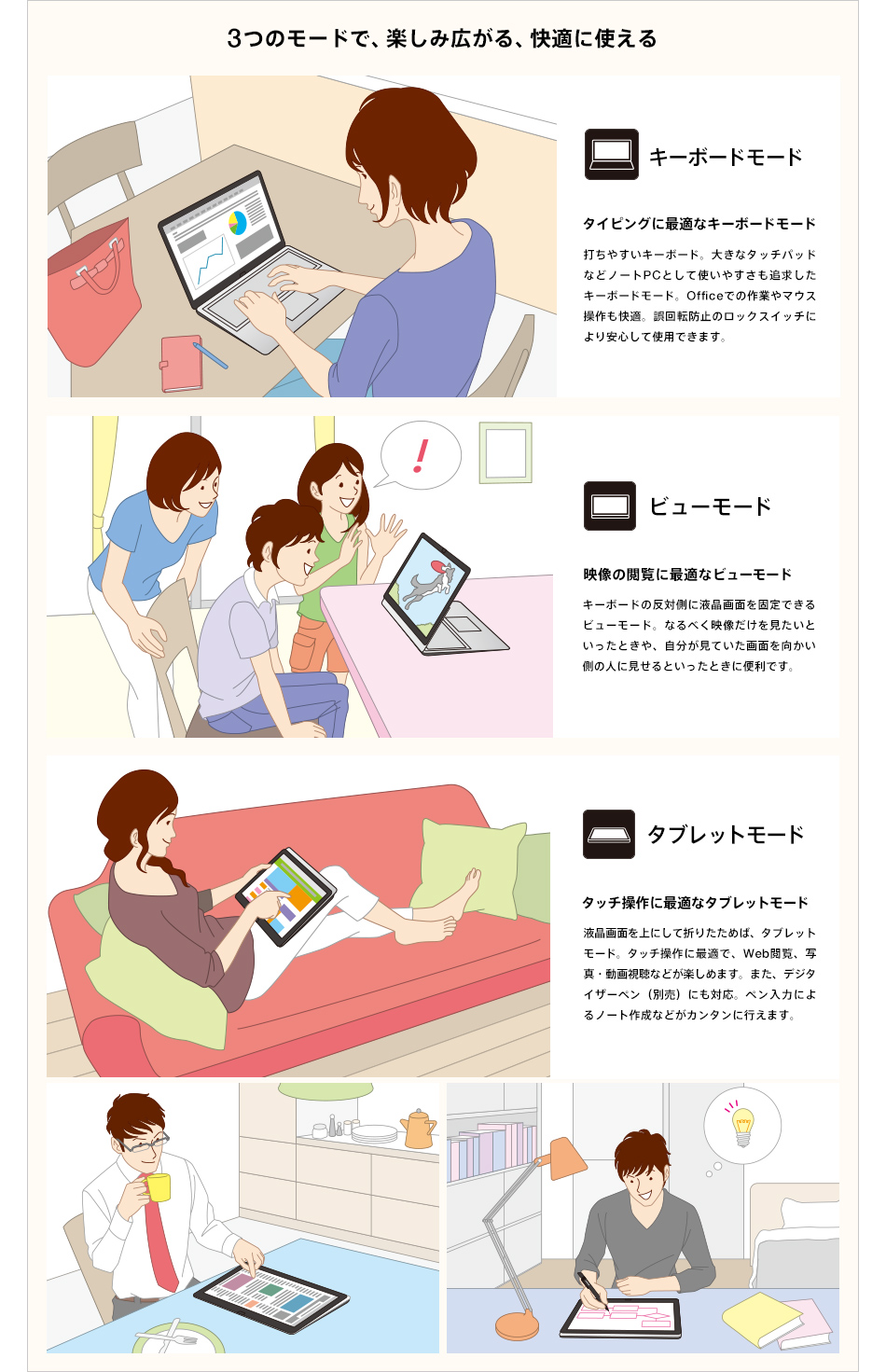 ノートPCとして快適に使える通常のキーボードモードだけでなく、液晶画面を上にしてパタッと倒すとタッチ操作やペン入力に最適なタブレットモード。さらに、液晶画面をキーボードの反対側に回転させると映像の閲覧などに便利なビューモードと、使い方に応じてカンタンにカタチを変えられます。
